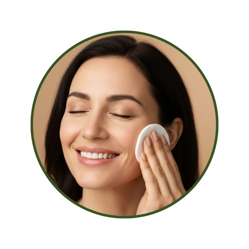 Prends un pad et passe-le délicatement sur ton visage, du centre vers l’extérieur, en évitant le contour des yeux et des lèvres.